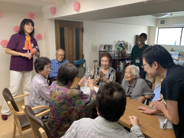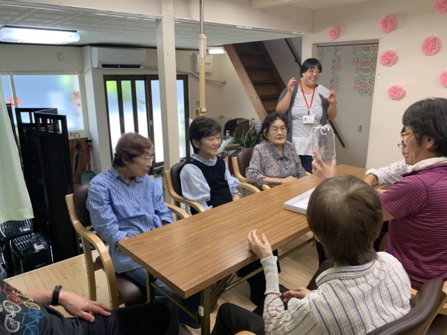 皆様、真剣に聞き入っておられます。スタッフも一緒に聞かせていただきましたが、福知山の民話もたくさんあるようです。植田様においては、福知山の小学校や保育園・幼稚園等の出向いて、紙芝居をされているようです。最初は一人で初めて、今は4人でされているとのこと。すべて、自分たちで企画されており、福知山で生まれたので、福知山の為になることをしたいと話されていました。