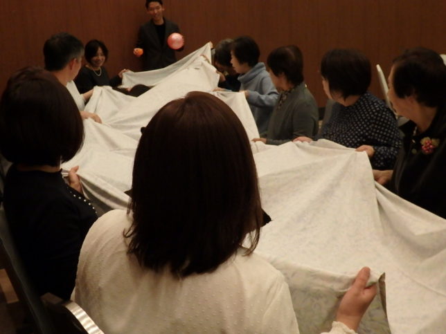 シーツの所々に穴が開いているので、ボール(時々 オムツも(笑))を落とさずに箱に入れるのにみんな大騒ぎ!にわかチームですが、お互いに声を掛け合って頑張りましたよ(^.^)